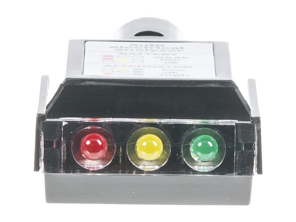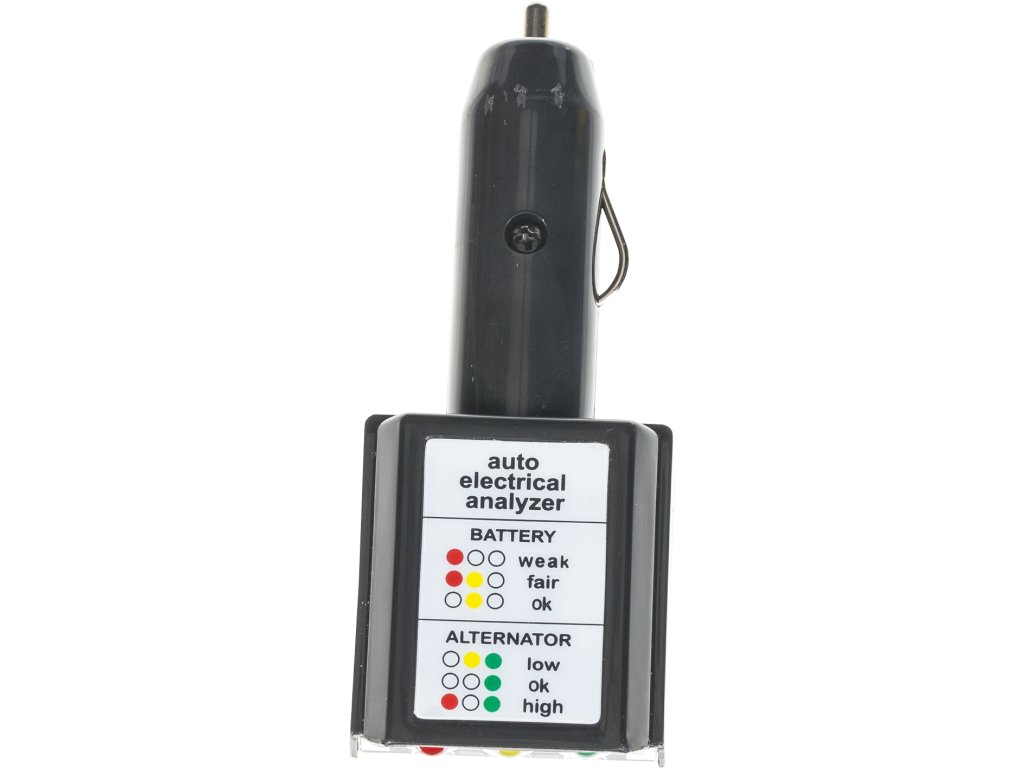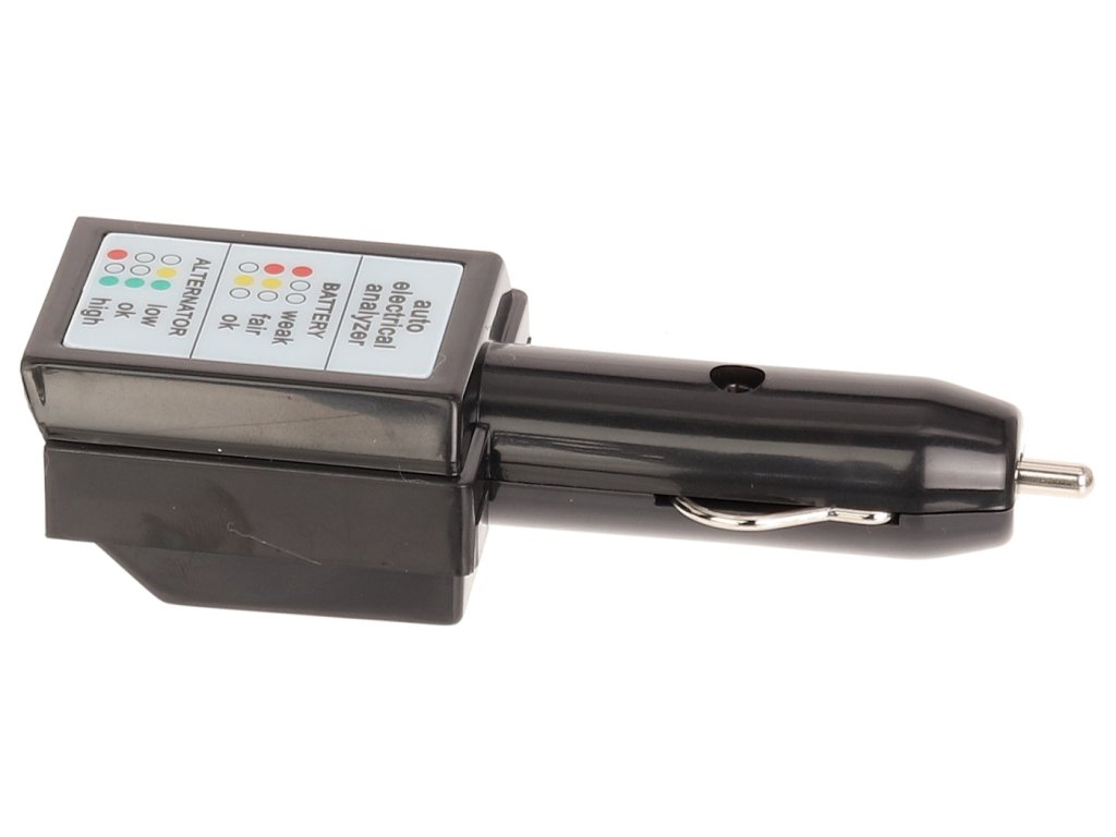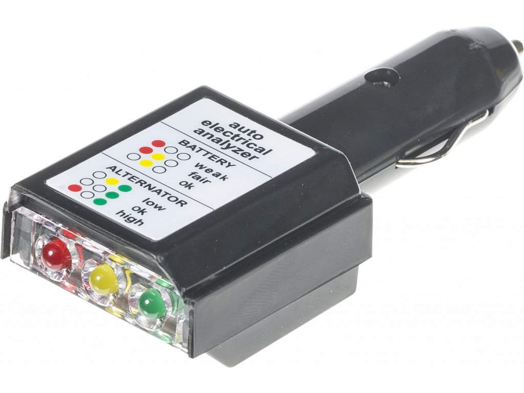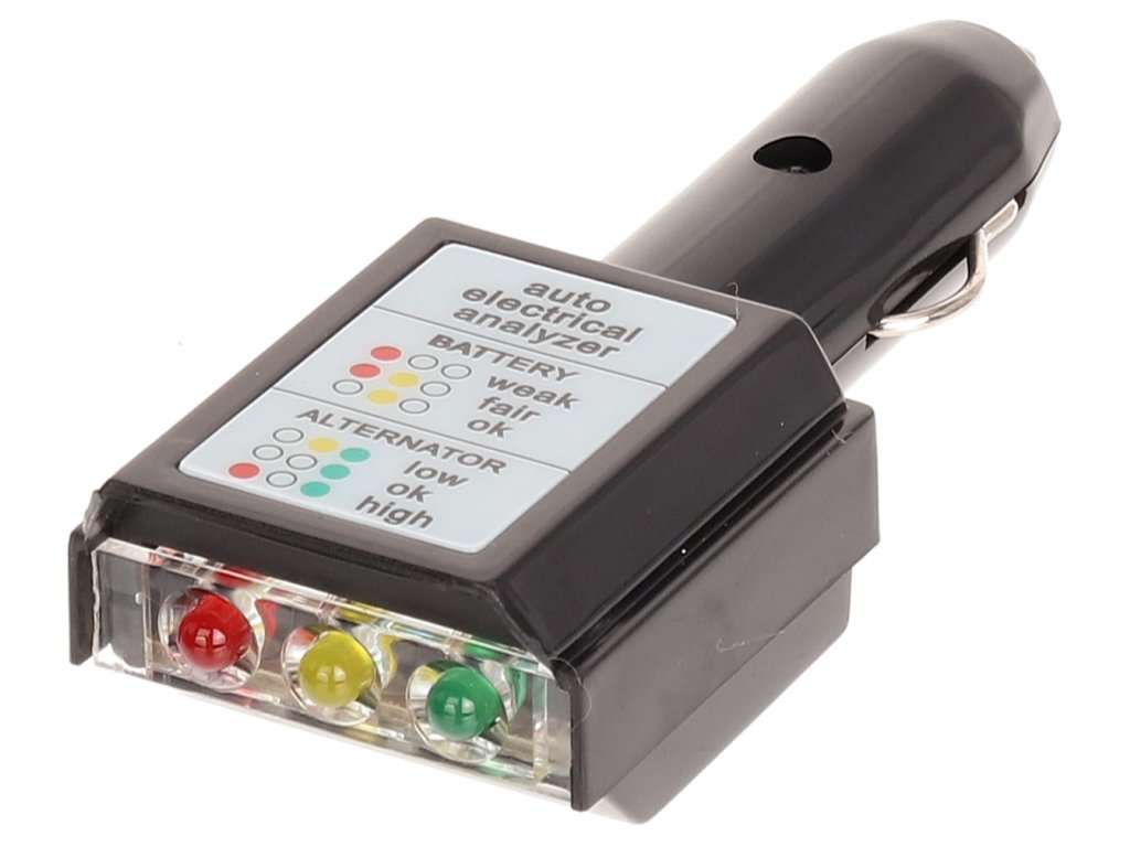 Evaluează starea de moment a bateriei auto și capacitatea de încărcare a alternatorului prin racordare în priza de brichetă a autovehiculului cu rețea de 12 V. Indicare a trei stări cu ajutorul LED color. Aparatul nu are alimentare proprie.