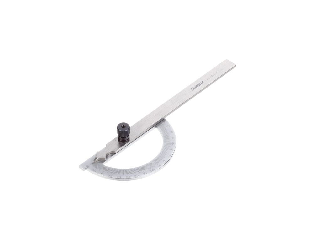 Raportor din oțel inoxidabil cu piuliță de blocare. Interval de scară 0 - 180°, împărțire cu 1°. Lungimea bratului 120 mm, latimea bazei 80 mm