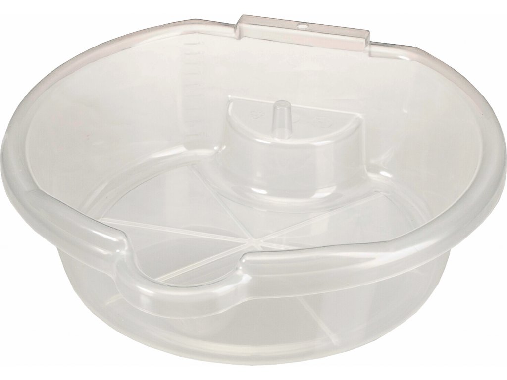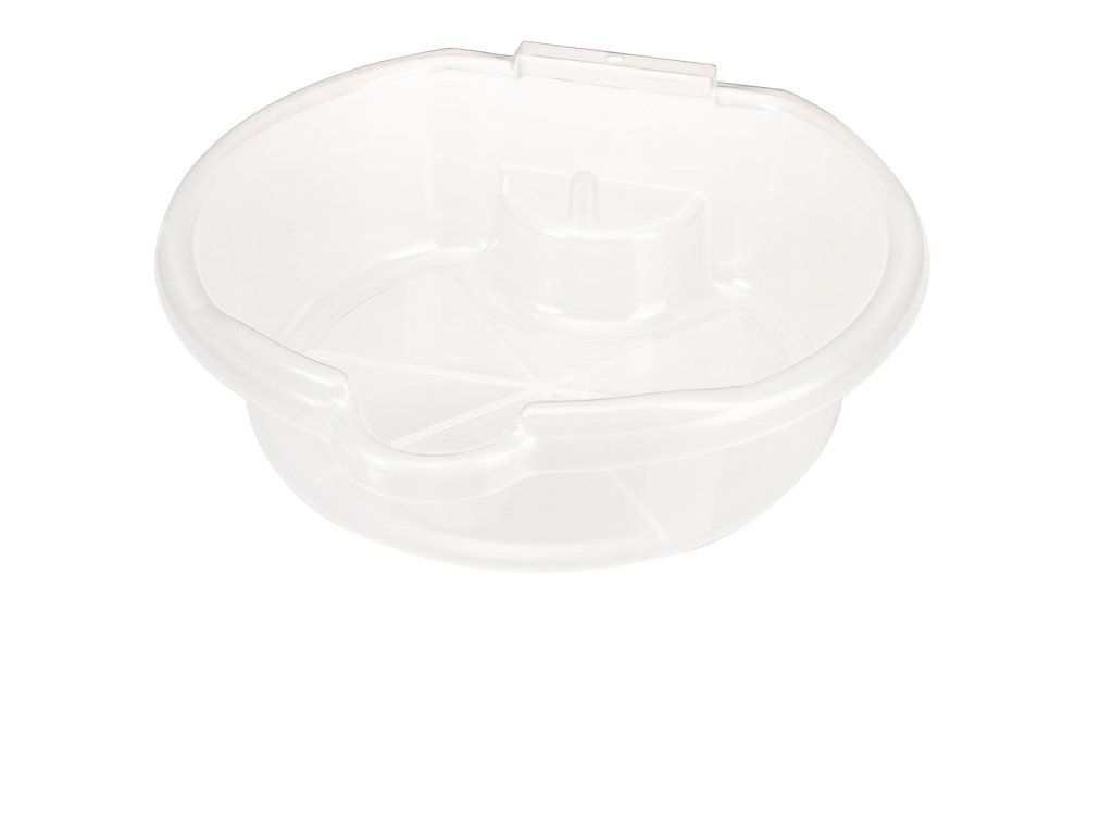 Datorită gradației până la 4,5 l pe peretele interior permite controlul imediat a volumului de lichid evacuat. Execuție transparentă din PP, rezistență termică –15 până la 105 °C, gradația divizată a câte 0,5 l, dimensiunile vasului circular 320 × 320 × 110 mm.